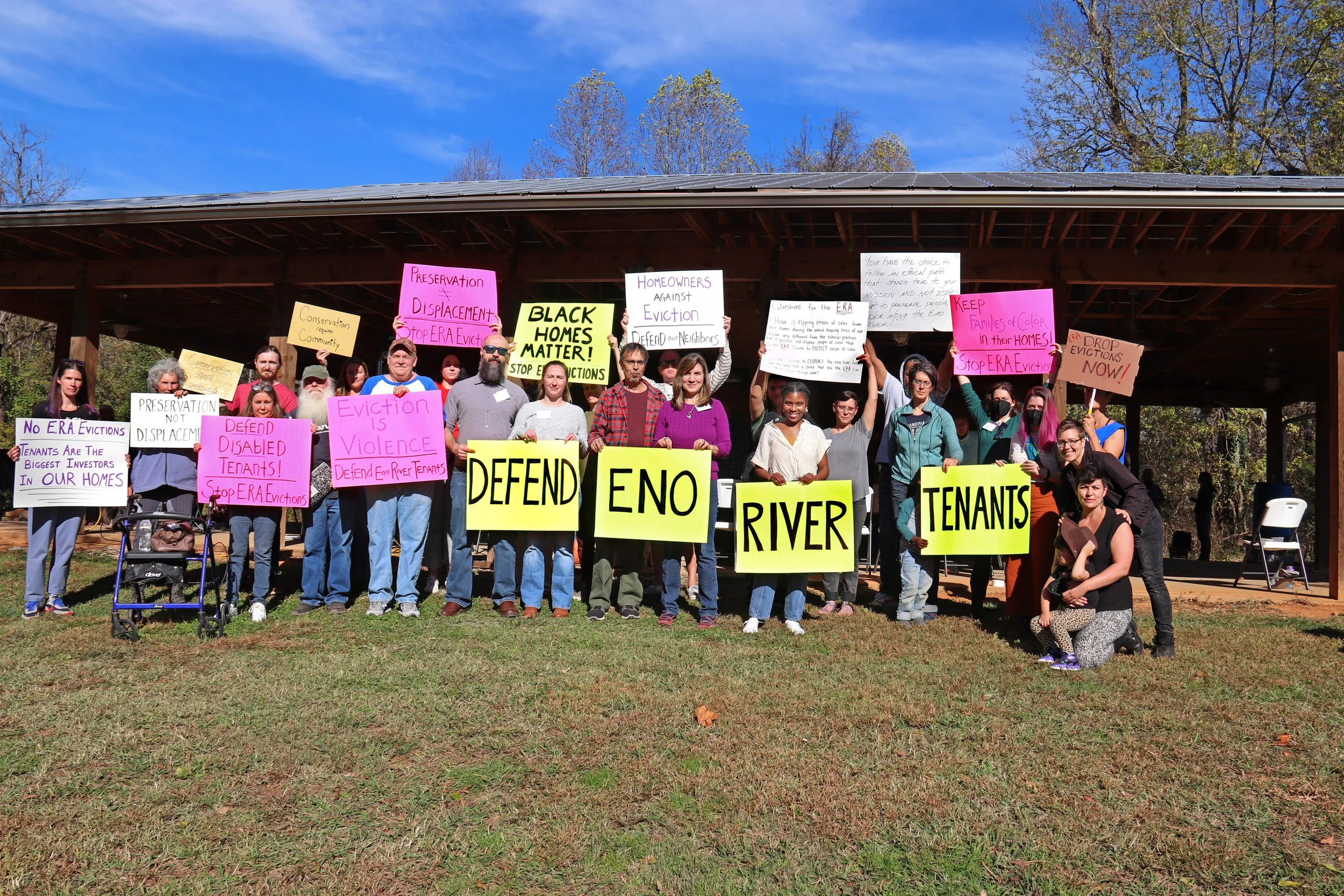 Though the work wasn’t done as “Community Land and Power”, the origin of this project started in 2022 when Leslie St Dre (CLP's founder and lead instigator) organized with their neighbors facing eviction, including Sheba Everett (CLP Advisory Board member) to stop their evictions and win their forever homes. They formed a united front as the Eno River Tenants' Association and issued a petition to hold the landlord accountable to their performative land acknowledgment and boldly demanded they stop the evictions, make full repairs, and turn over the homes to tenants using the shared equity land trust model. After ERTA also interrupted their landlord's annual meeting, carried out multiple call-in and targeted email campaigns, got multiple articles in the press, including one that was front page news, and the petition reached over 700 signatures (a high number for Durham), the landlord agreed to temporarily stop the evictions.